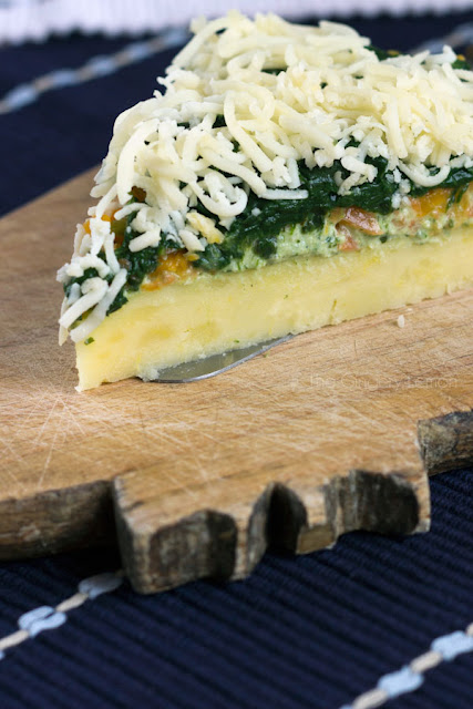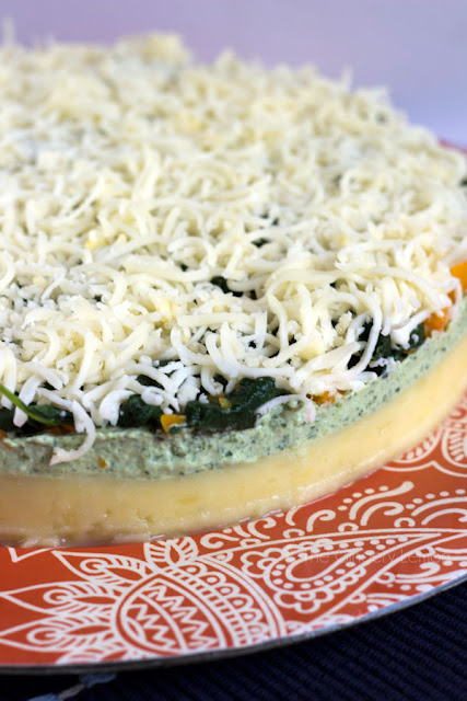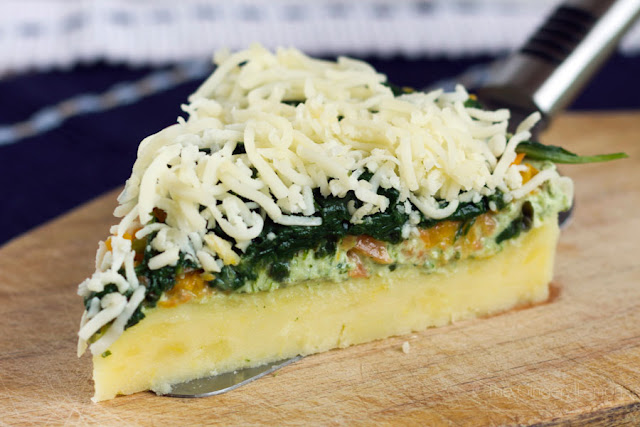 Взима се форма за торта с подвижно дъно и на дънното и се сипва пюрето. Заравнява се с лъжица. Отгоре се слага сместа от катък, над нея рендосаните моркови и се завършва със запарените листа спанак.