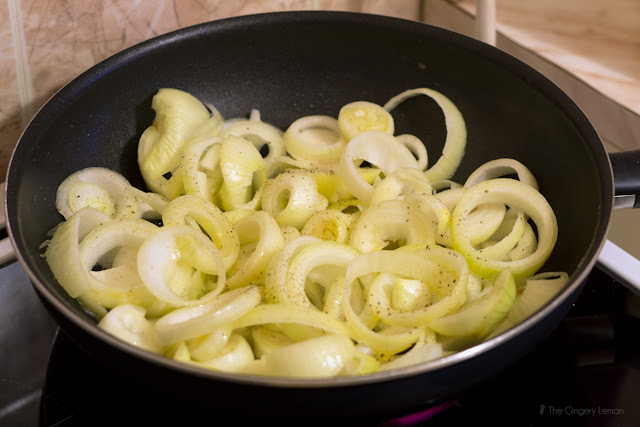 Загрява се голям тиган с капак (уок върши чудна работа). В него се разтопява маслото и меда. Добавя се лука и се разбърква, така че всички шайбички да се покрият равномерно със сосчето. Поръсва се с черен пипер.