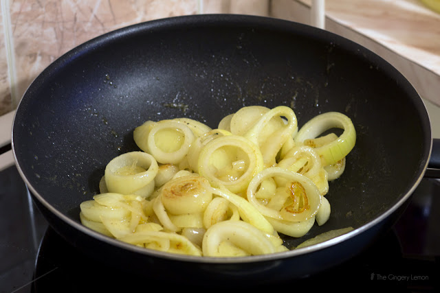 Слага се капак на тигана и се задушава на средна температура 15-на минути докато омекне и се зачерви приятно. От време на време се разбърква.