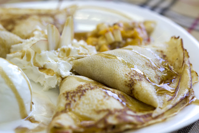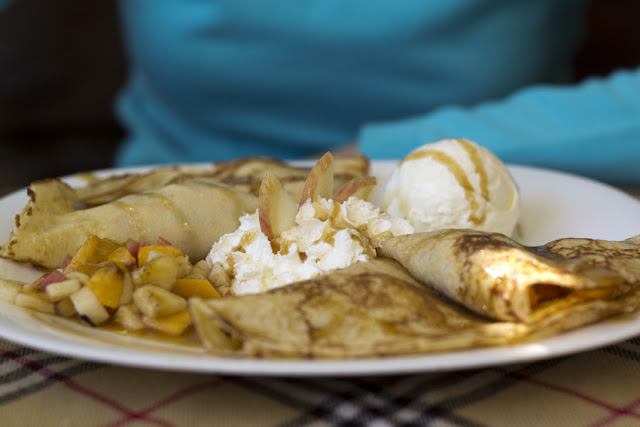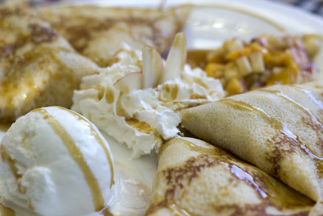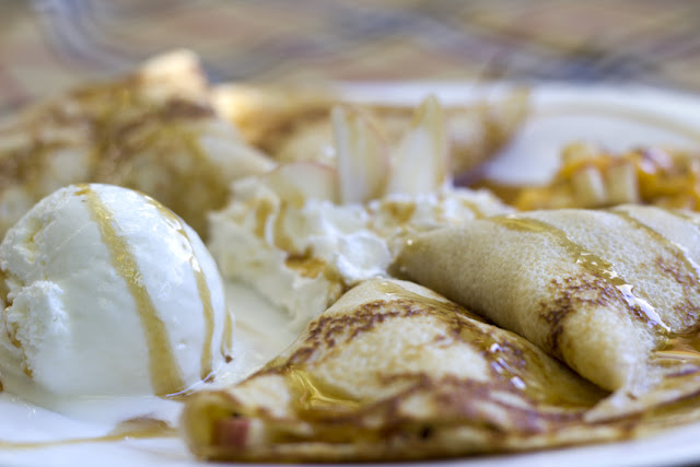 Пълнежът на палачинката е от сочни карамелени плодове, които се комбинират прекрасно със сметанов сладолед и филирани бадеми.