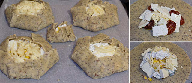 Техниката за разточване и пренасяне на тесто съм описала тук. Всяка част от тестото се разточва и с помощта на чиния се оформа правилен кръг като излишъкът тесто се изрязва с нож. Оформената подложка се пренася върху тавичка, постлана с хартия за печене, и в центърът и се поставя комбинация от сирена със сушени домати или царевица като се оставят два пръста разтояние до ръба.