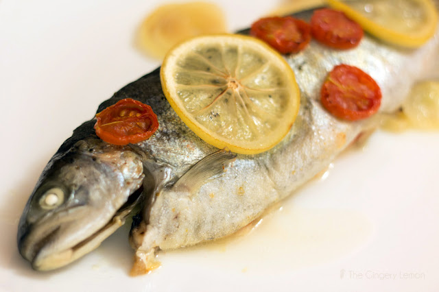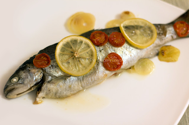 Отгоре рибата се намазва със зехтин и се поръсва със сол и черен пипер. Върху нея се нареждат резенчета лимон и домат. Поръсва се отново със зетин.