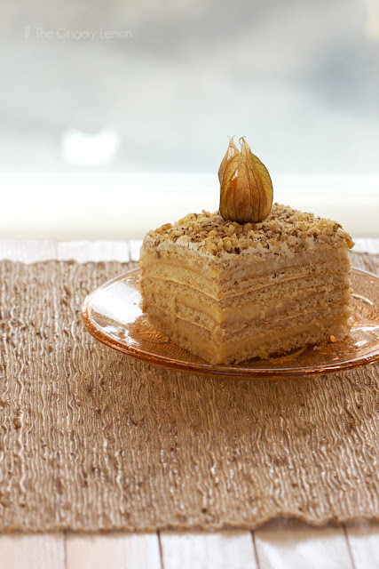Тортата я направих по бързата процедура с готови блатове, които купих от руски магазин. А за пълнеж направих сладкарски яйчен крем и крем от квасена сметана.