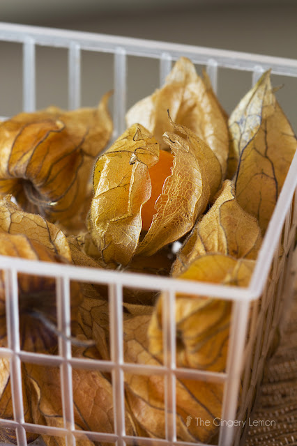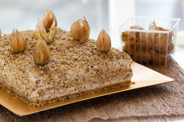 Оставя се малко крем от квасена сметана, с който да се покрие тортата. Поръсва се със счукани орехи и се украсява с физалис. Тортата трябва да престои няколко часа в хладилник. Най-добре е да се остави да престои една нощ.