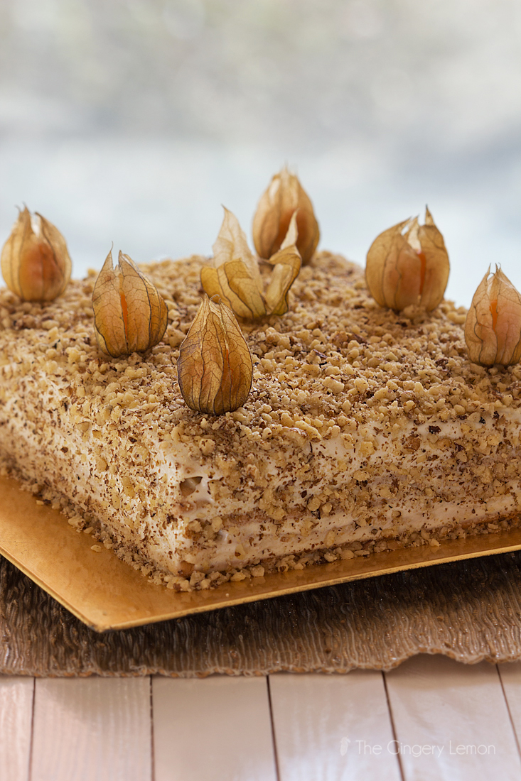 Оставя се малко крем от квасена сметана, с който да се покрие тортата. Поръсва се със счукани орехи и се украсява с физалис. Тортата трябва да престои няколко часа в хладилник. Най-добре е да се остави да престои една нощ.