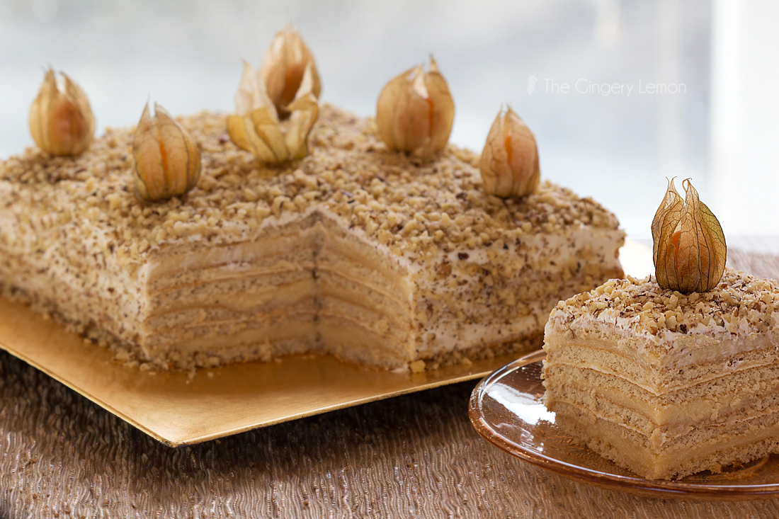 Тортата я направих по бързата процедура с готови блатове, които купих от руски магазин. А за пълнеж направих сладкарски яйчен крем и крем от квасена сметана.